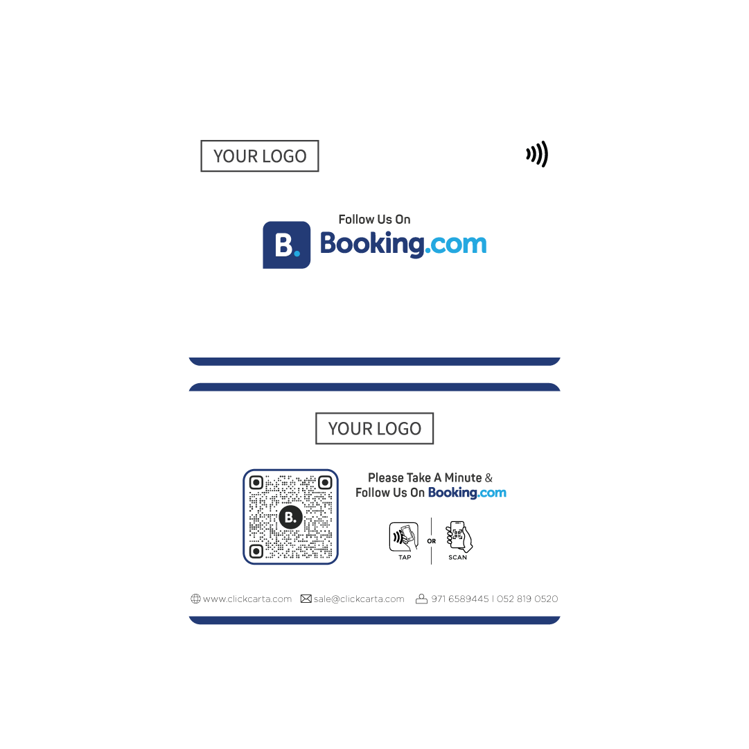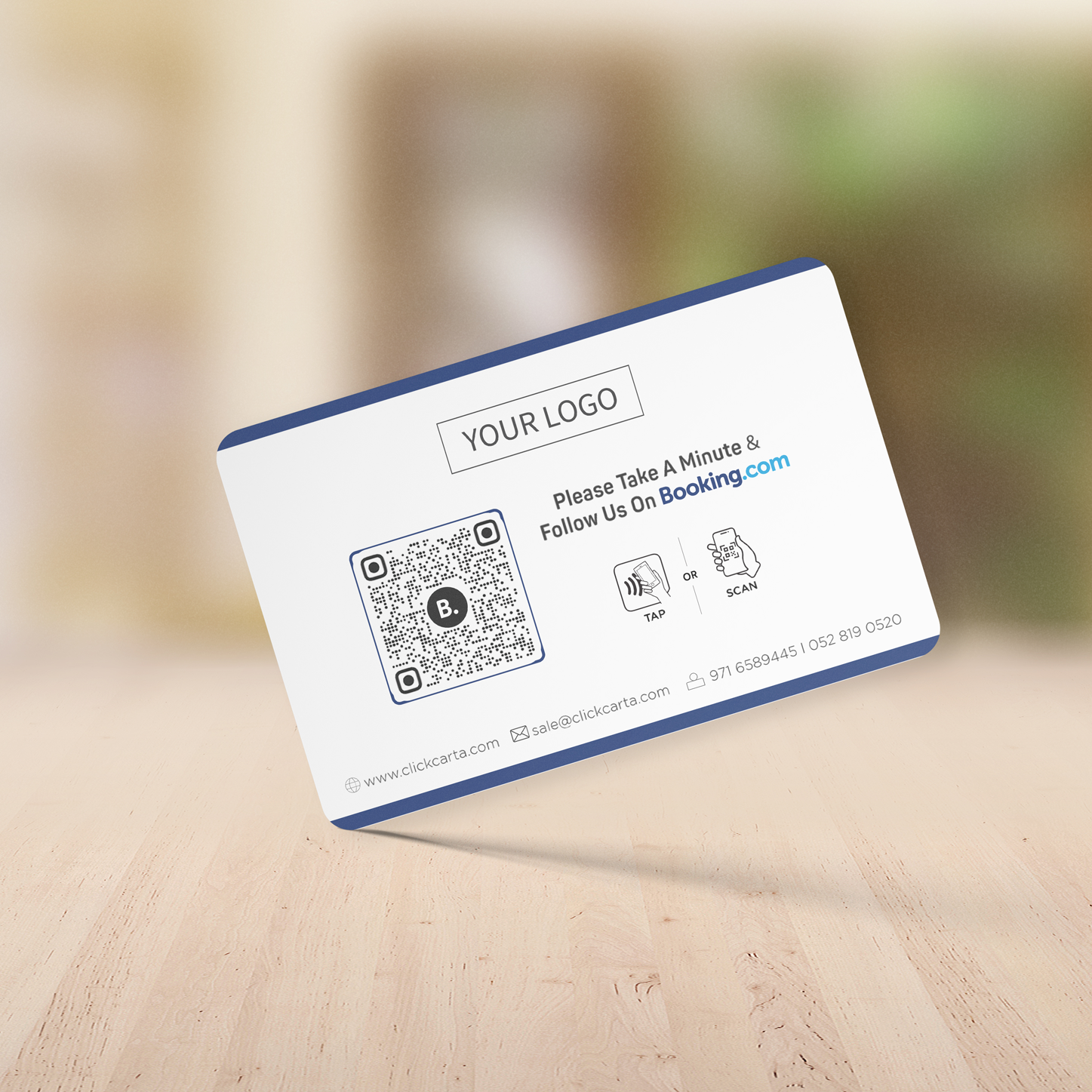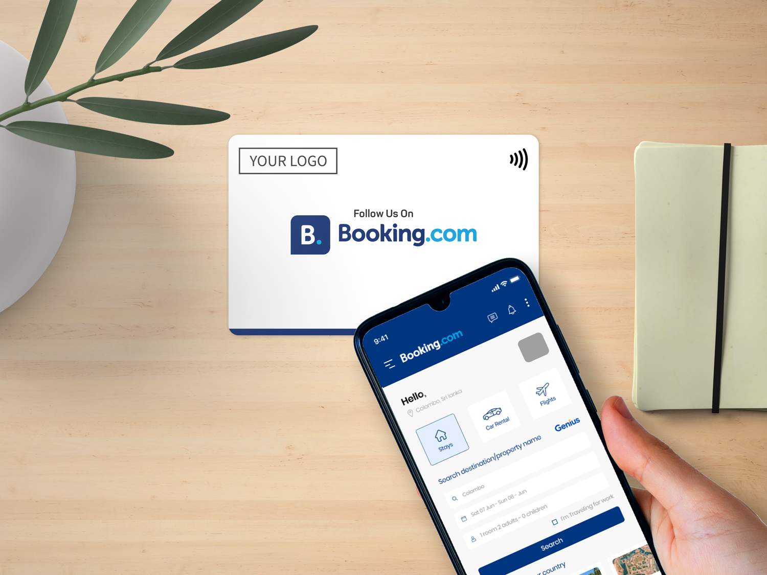 The eye-catching design of the Booking.com Review NFC Cards sparks customers’ interest, and the Call-To-Action encourages them to review your business on Booking.com .