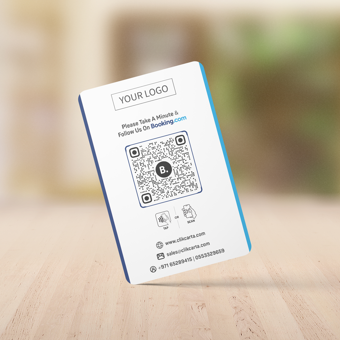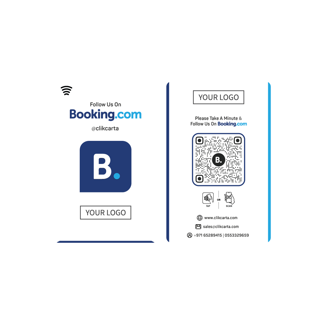 The eye-catching design of the Booking.com Review NFC Cards sparks customers’ interest, and the Call-To-Action encourages them to review your business on Booking.com .