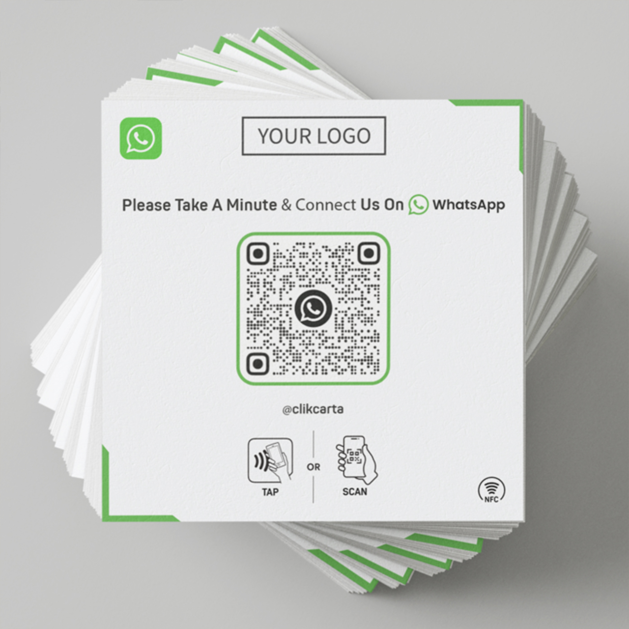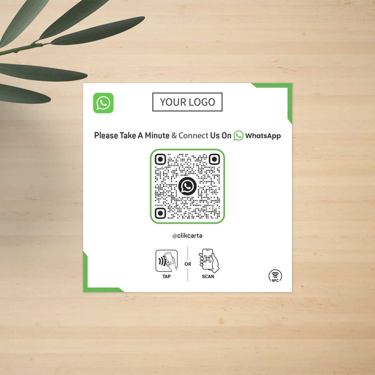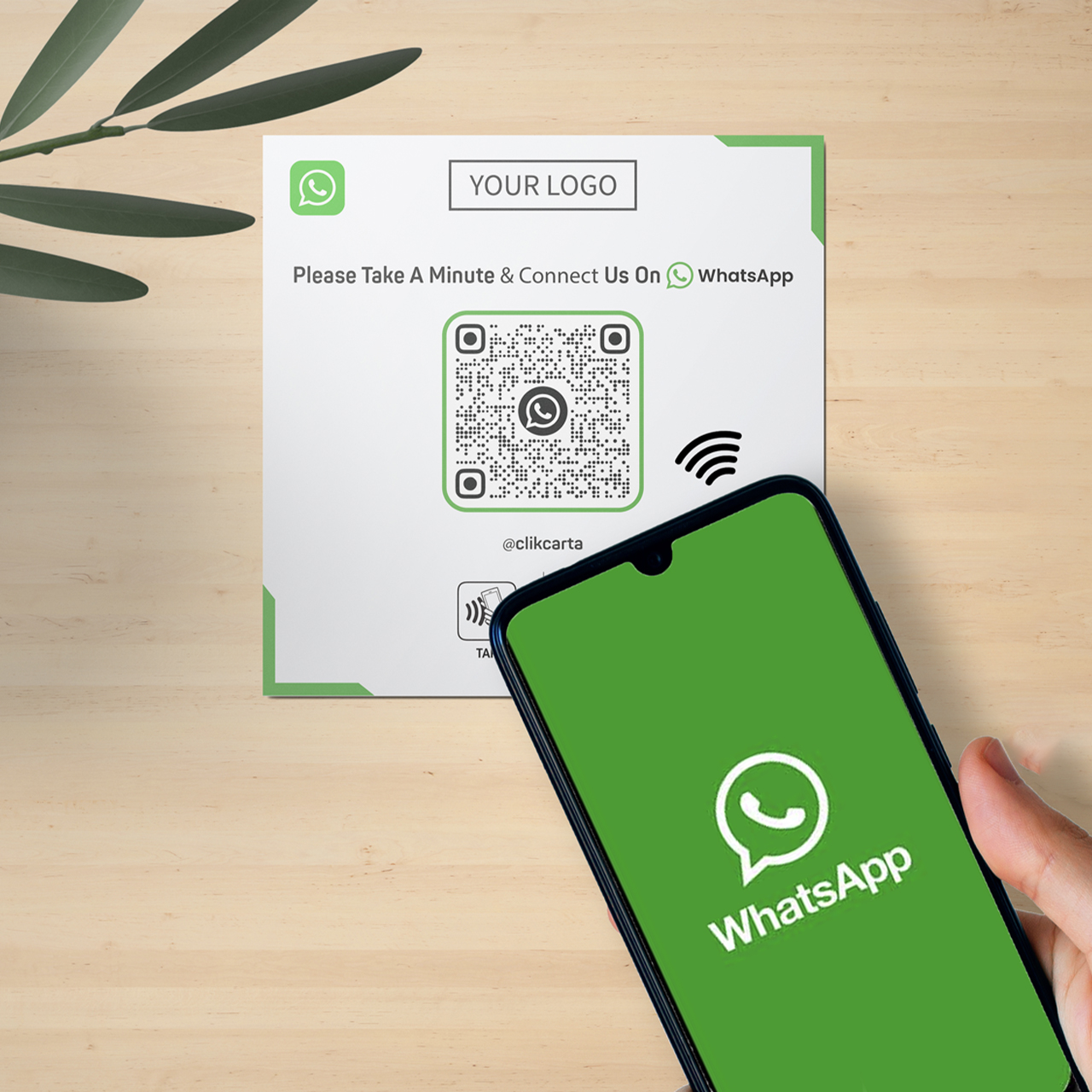 Personalized with your own QR code, which leads your customers directly to your WhatsApp chat, your WhatsApp phone number and your own logo.