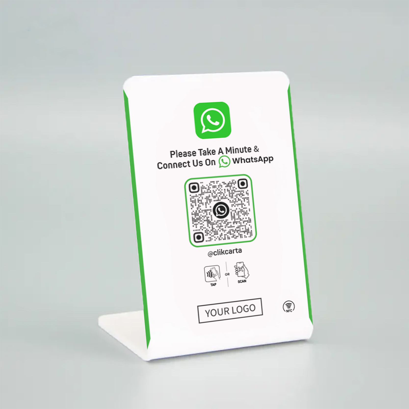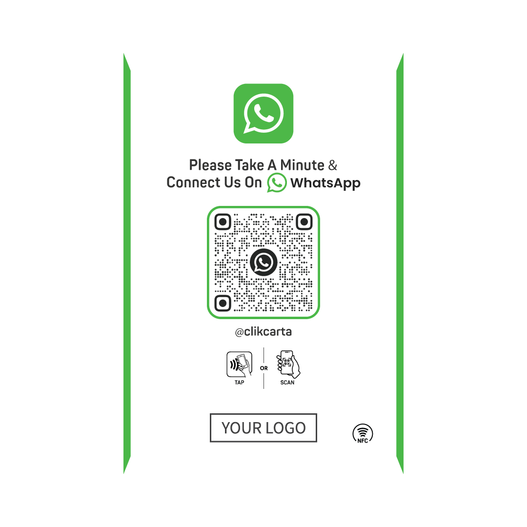 Personalized with your own QR code, which leads your customers directly to your WhatsApp chat, your WhatsApp phone number and your own logo.